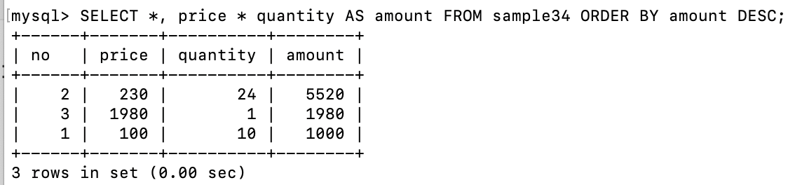 SELECT *, price * quantity AS amount FROM sample34 ORDER BY price * quantity DESC;