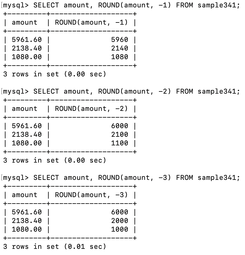 SELECT amount, ROUND(amount, 1) FROM sample341;