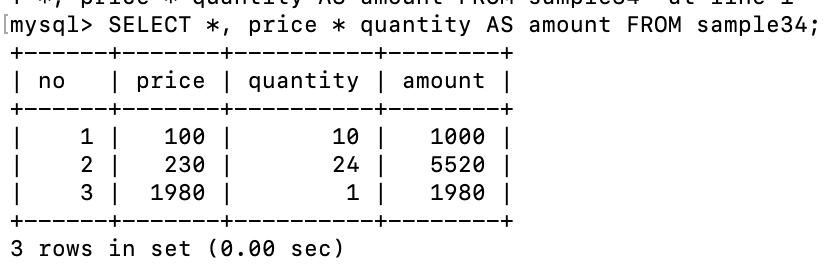 SELECT *, price * quantity AS amount FROM sample34;